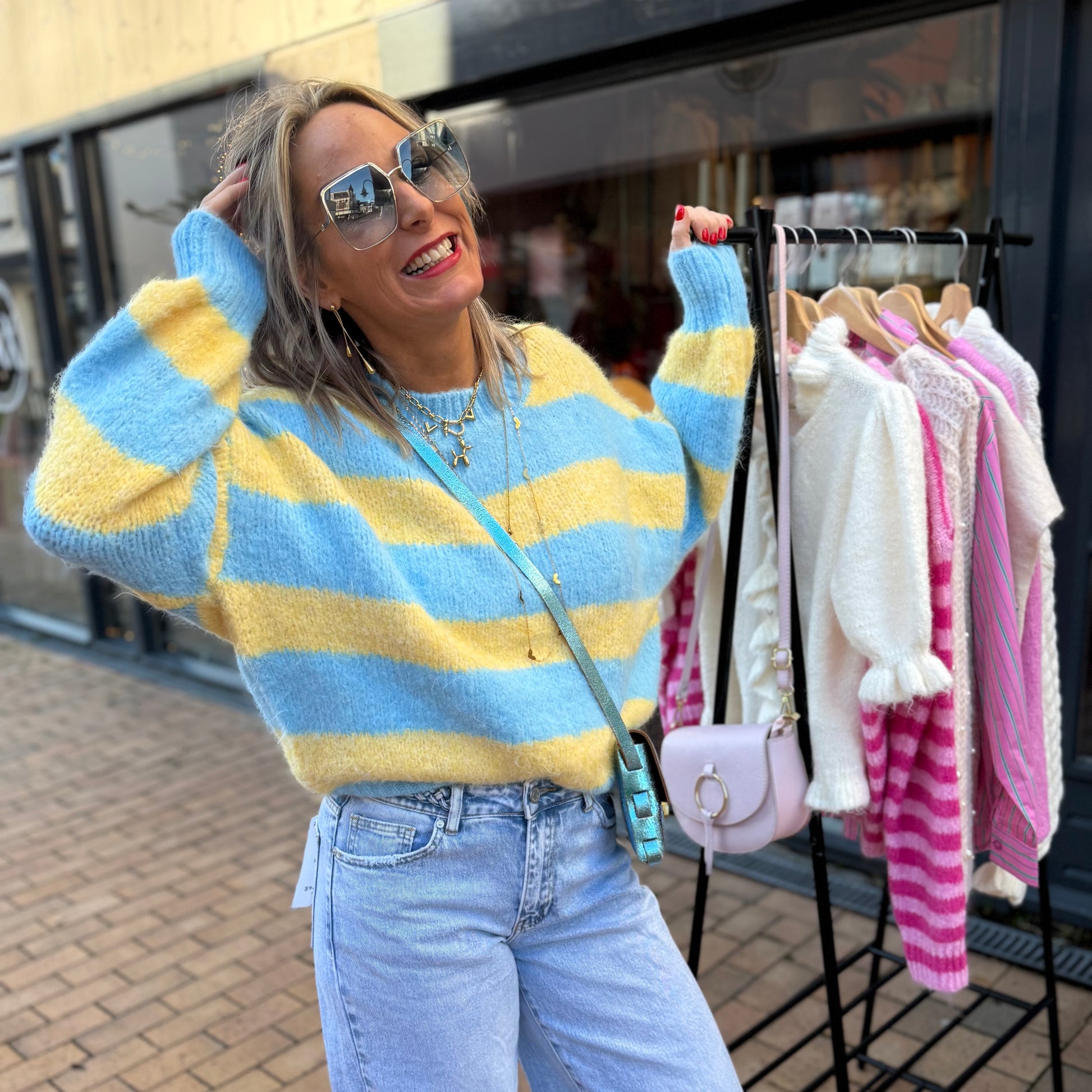 Deze trui gemaakt van een gebreid materiaal, waardoor hij heerlijk warm is en niet kriebelt! Deze heeft lange pofmouwen, een ronde halslijn en is voorzien van een streep patroon.
